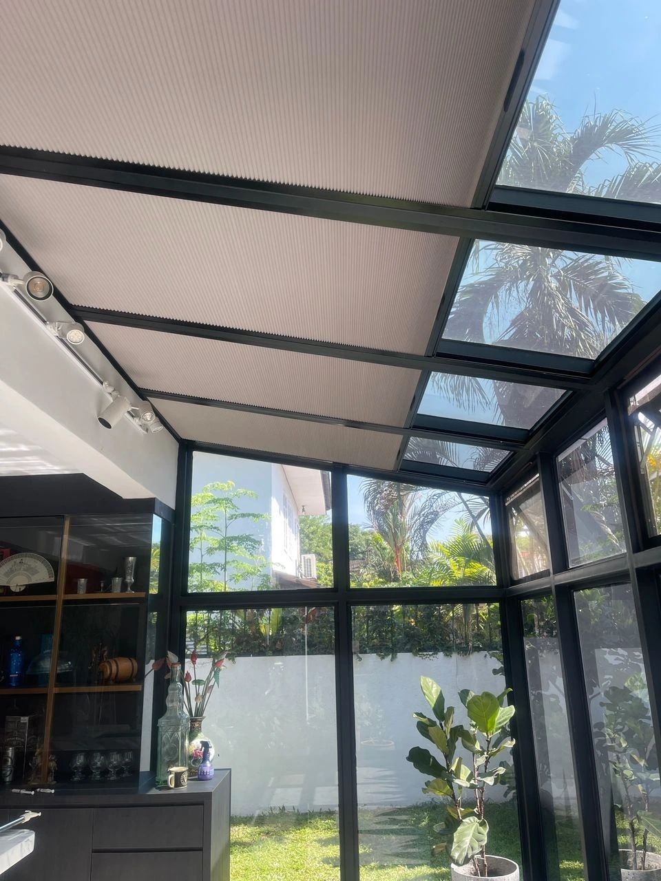 Simple and stylish roll to side that provide shade and UV protection for clear rooftop.